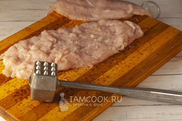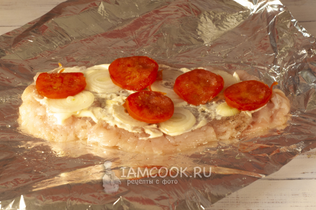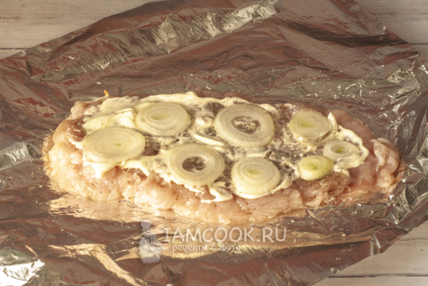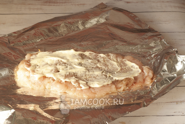 Лист фольги разложим на столе, чуть смажем подсолнечным маслом. На лист выложим отбитое мясо. Смажем пласт майонезом.