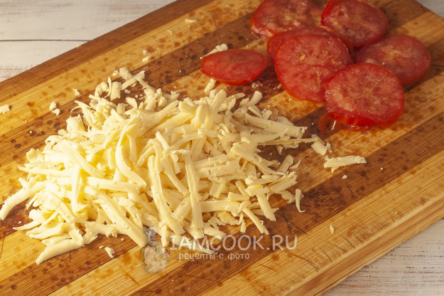 Помидор вымоем и тоже тонко нарежем. Сыр натрем на терке. В данном случае нам не важно на крупной или мелкой терке тереть сыр — он все равно расплавится.
