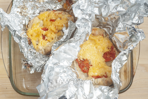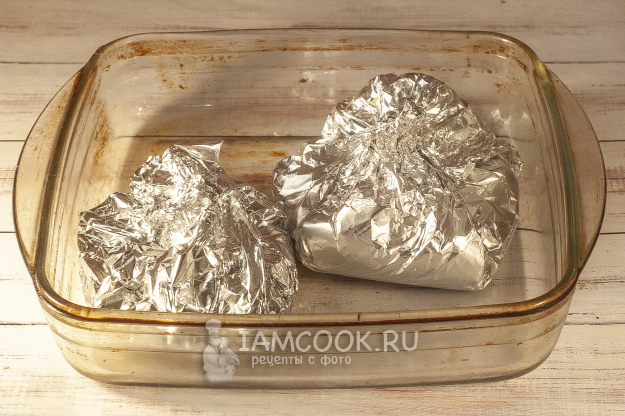 Завернем обе отбивные в фольгу и выложим на противень. Поставим в разогретую духовку (180 градусов).