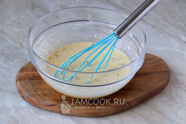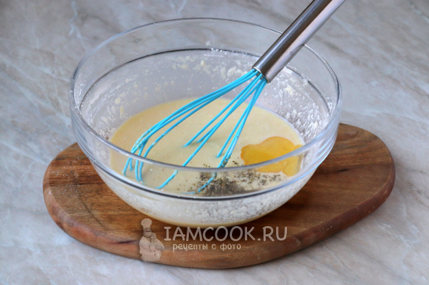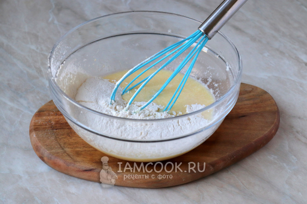 Введите просеянную пшеничную муку и снова перемешайте, чтобы не было мучных комочков.