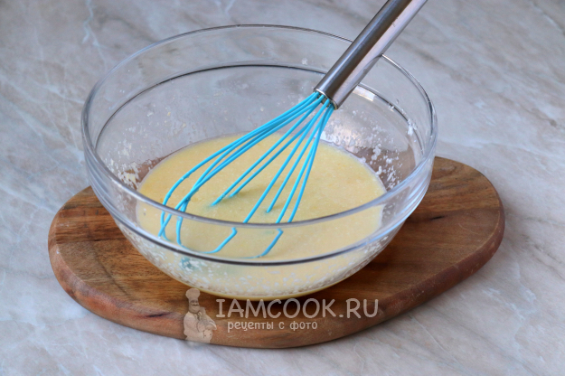Затем влейте в миску тёплое молоко, добавьте куриное яйцо, соль и немного сахарного песка. С помощью венчика тщательно перемешайте.