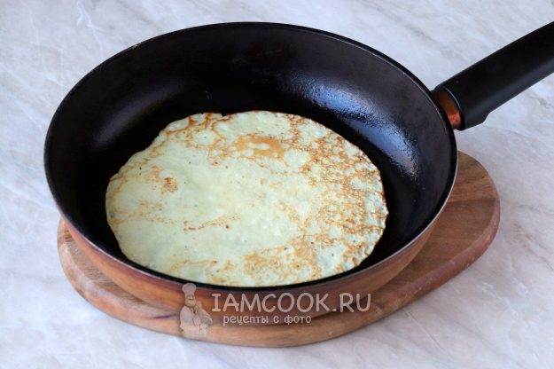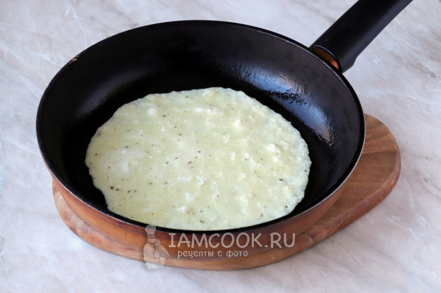 Сковороду смажьте растительным маслом и хорошо прогрейте. Затем влейте порцию теста, вращающими движениями распределите его по всему дну, сформировав круглую заготовку.