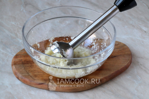 Капусту промойте холодной водой, обсушите и нарежьте произвольными кусочками. Сложите их в специальную чашу или объемную миску и измельчите блендером до кашеобразного состояния.