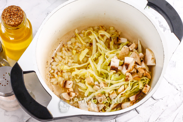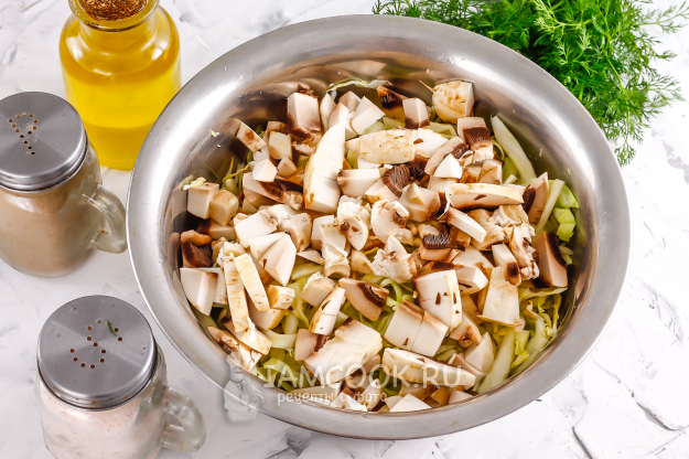 Грибы промойте в воде и нарежьте средними кубиками. Сильно не измельчайте, иначе они не будут ощущаться в начинке. Добавьте нарезку в емкость к капусте.
