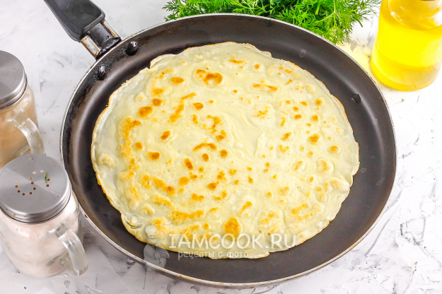 В это время прогрейте блинную сковороду и испеките на ней все блины, вливая часть теста на ее дно и выпекая блин с каждой стороны по 1-2 минуты.