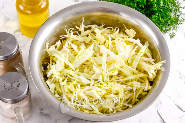В это время счистите с вилка капусты верхние листья и разрежьте его пополам. Нарежьте лентами необходимую часть и выложите ее в глубокую емкость. Всыпьте 2 щепотки соли и промассируйте нарезку, чтобы она выпустила сок. Благодаря этому капуста быстрее поджарится.