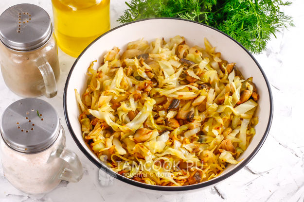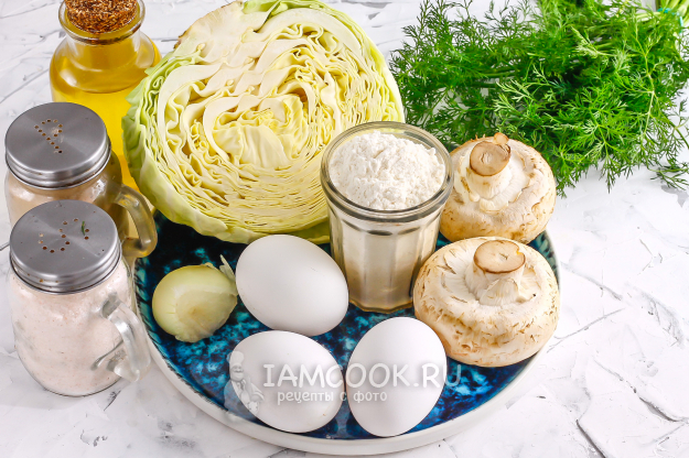 Подготовьте необходимые ингредиенты для сочных блинов с капустой и грибами.