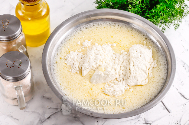 Затем вмешайте пшеничную муку и влейте растительное масло. Оставьте блинное тесто на 15-20 минут в покое.