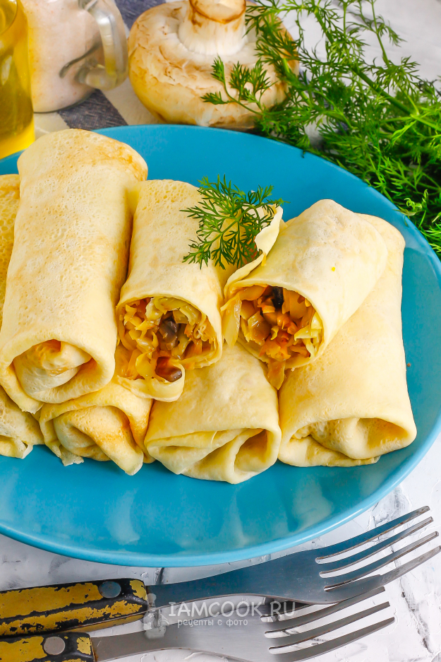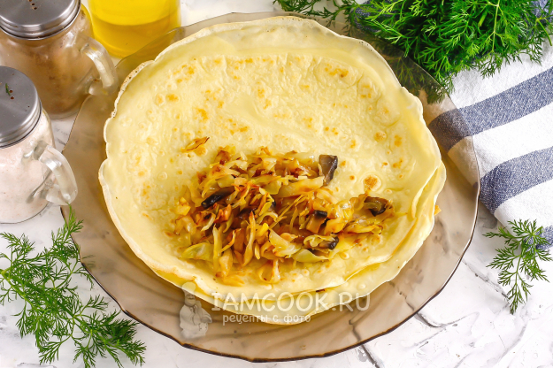 Начините все блины таким образом и подайте их к столу. Особенно вкусно блины с капустой и грибами подавать со сметаной или чесночным соусом.