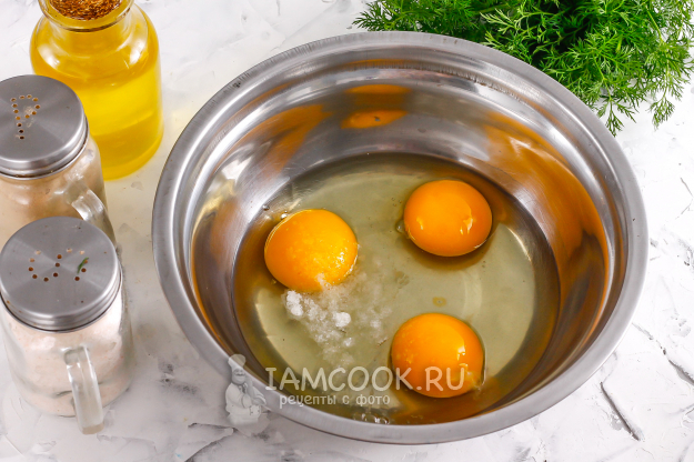 Куриные яйца вбейте в глубокую емкость, влейте туда же воду, всыпьте соль и взбейте все примерно 1-2 минуты.