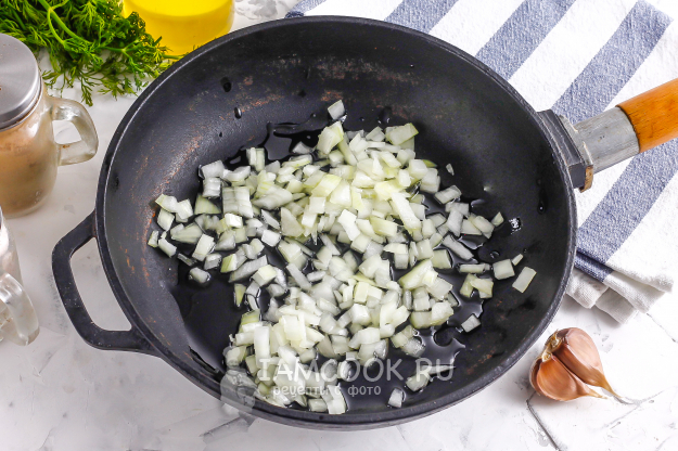 Как только мясо будет готово, очистите морковь и лук от кожуры, промойте в воде. Лук нарежьте мелким кубиком и отпассеруйте на растительном масле в сковороде примерно 2-3 минуты.