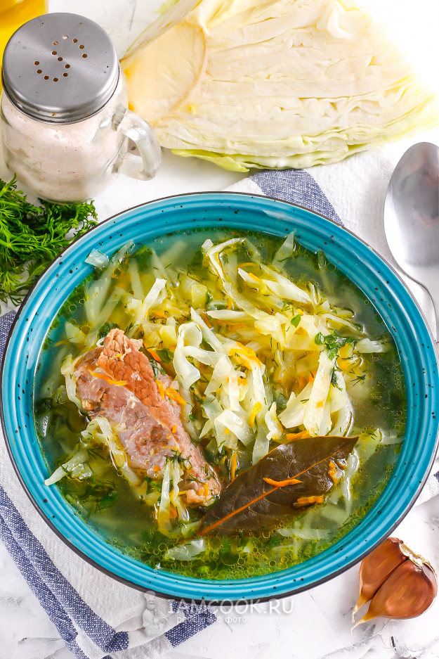 Готовые горячие щи из свежей капусты без картошки разлейте в тарелки и подайте к столу вместе с хлебом, несладкой выпечкой, пампушками с чесноком и т.д.