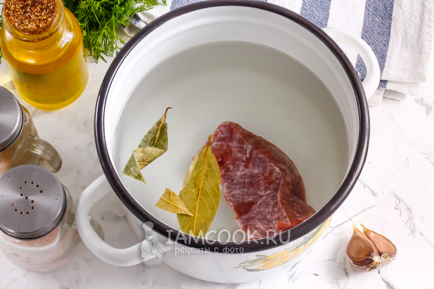 Говядину промойте в воде, выложите в кастрюлю. Влейте холодную воду и выложите лавровые листья. Для получения ароматного бульона вливают холодную воду, чтобы при ее нагревании мясо выделяло в воду свой сок. Для получения сочного мяса воду добавляют горячую, чтобы она сразу же запечатала все срезы мяса и сок остался в середине. Отварите говядину на умеренном нагреве примерно 1 час, удаляя образовавшуюся пену.