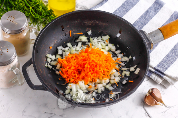 Морковь натрите на терке с мелкими ячейками и добавьте на сковороду к луку. Поджарьте еще 2-3 минуты и выключите нагрев. При добавлении томатной пасты на сковороду протомите зажарку еще несколько минут.