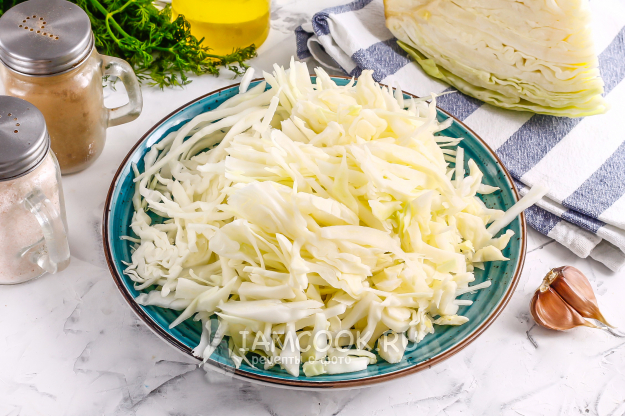 Белокочанную капусту очистите от верхних листьев, часть ее нарежьте лентами.