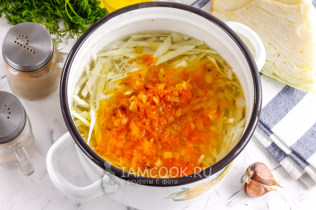 Выложите в кастрюлю нарезку капусты и приготовленную зажарку. Всыпьте соль. Отварите щи примерно 5-7 минут, до смягчения капустной нарезки. Главное при этом - не дать ей стать кашей. То есть нарезка капусты должна стать мягкой на вкус, но сохранить свою форму.