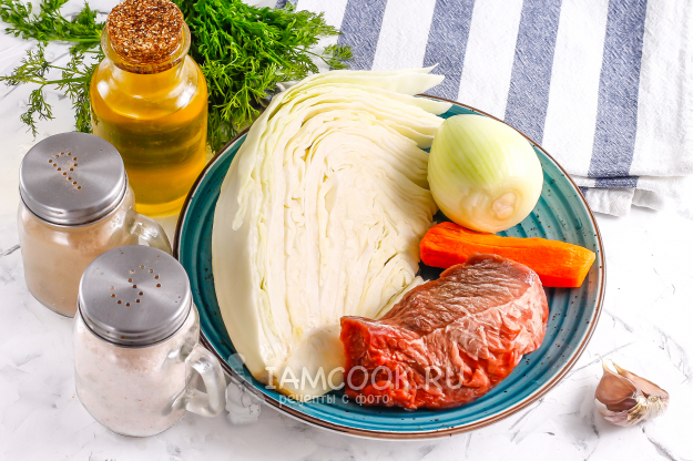 Подготовьте необходимые ингредиенты для мясных щей из свежей капусты без картошки.