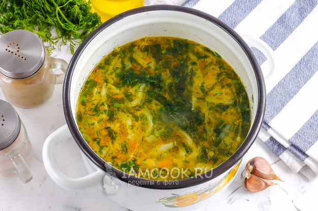 Измельчите свежую зелень, предварительно промыв ее в воде. Добавьте в щи за 2-3 минуты до окончания варки. Очистите зубчик чеснока и спрессуйте его в кастрюлю, перемешайте.