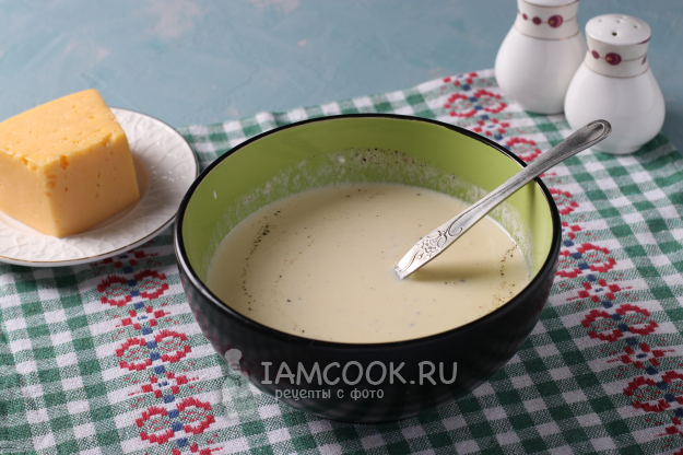 Приготовить заливку из яиц, сливок и сметаны, немного посолить и поперчить.