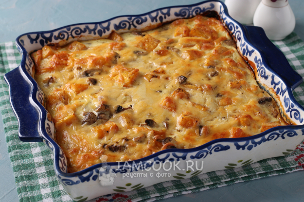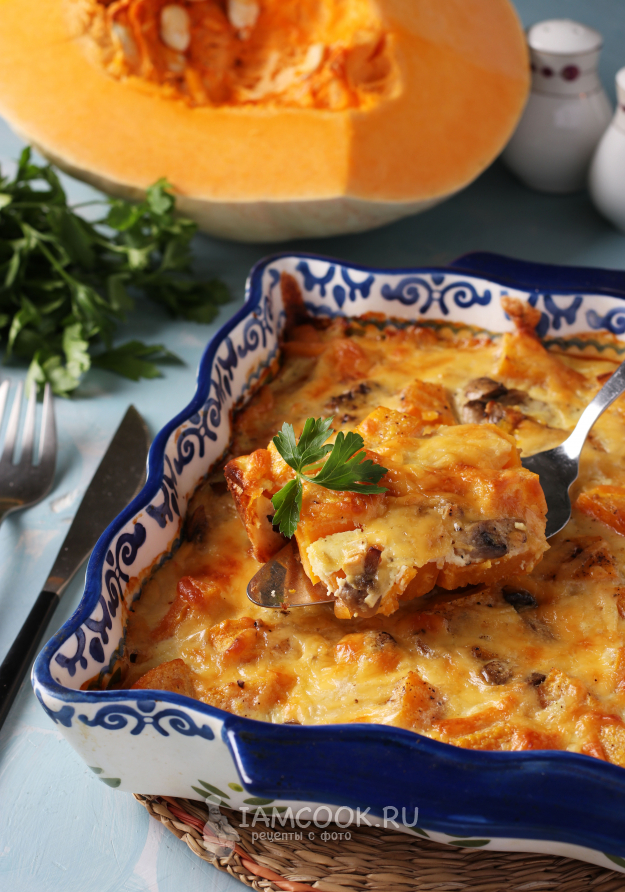 Горячую или тёплую запеканку из тыквы с грибами разрезать и подать к столу.