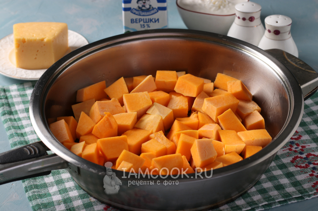 Тыкву очистить от кожуры и семечек, нарезать кубиками 1.5-2 см.
