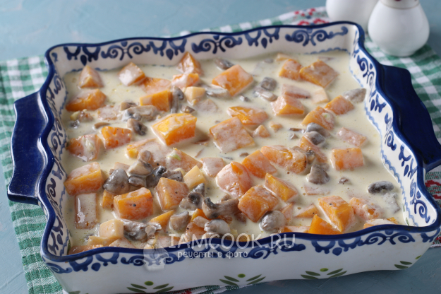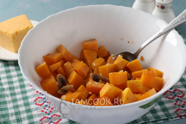 Нарезать кубиками половину сыра, добавить его к тыкве с грибами. Форму смазать маслом и обсыпать манкой или панировочными сухарями. Высыпать тыкву с грибами и сыром, сверху вылить подготовленную заливку.