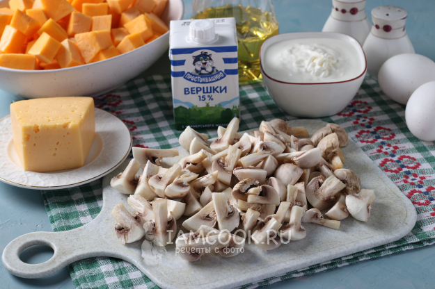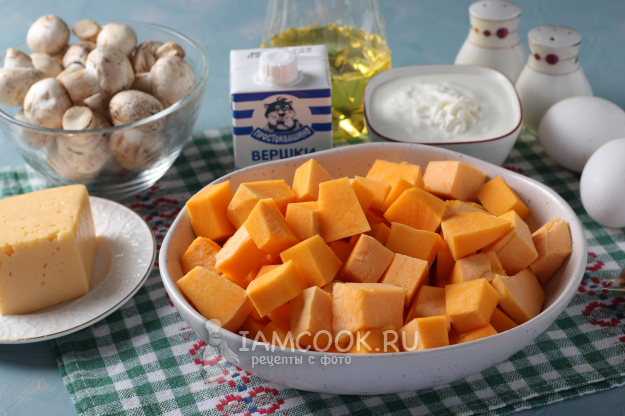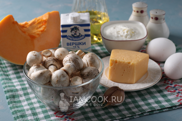 Для приготовления запеканки из тыквы с грибами подготовить из списка необходимые ингредиенты.