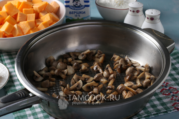 Убрать грибы со сковороды, добавить туда тыкву, накрыть крышкой и тушить 10 минут на небольшом огне.