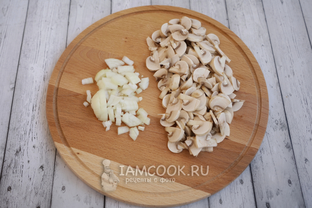 Для приготовления начинки моем и нарезаем мелко 150 г шампиньонов, затем очищаем некрупную луковицу и тоже измельчаем.