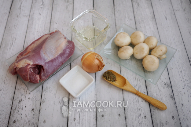 Для приготовления рулета из бедра индейки с грибами в духовке нам потребуются следующие ингредиенты. Луковицу стоит выбрать небольшую. Если таких нет, то потребуется не больше половинки крупной. Специи выбирайте те, что вы любите.