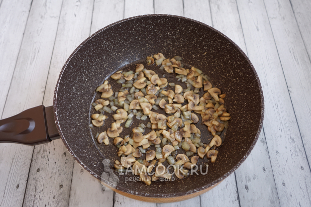 Вливаем в сковороду 30 мл растительного масла и обжариваем лук с грибами, в конце жарки немного солим.