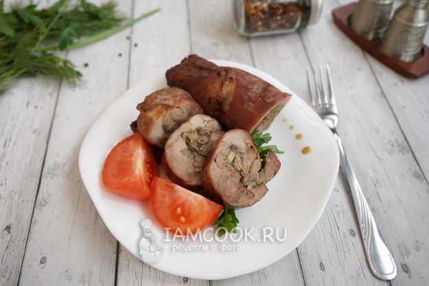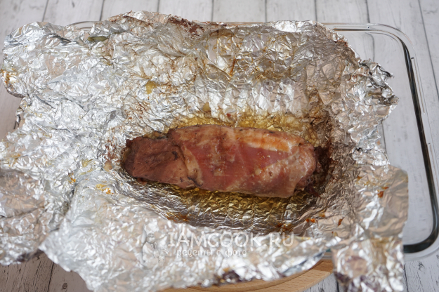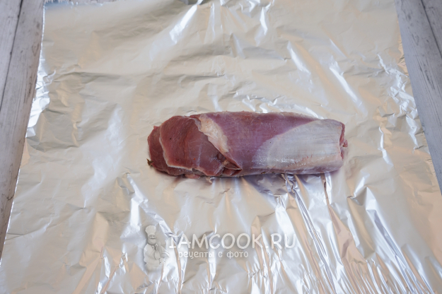 Аккуратно сворачиваем мясной рулет и переносим его на лист фольги. Обвязать рулет нитками, чтобы не распался при запекании, можно и сейчас, но лично я больше люблю перевязывать поверх фольги – так удалять нитки после приготовления удобнее.