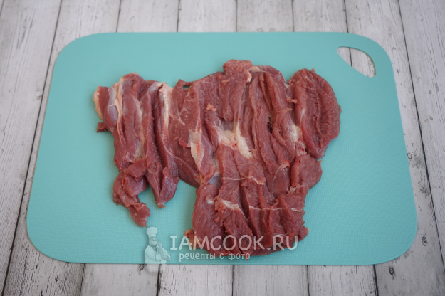 Начинаем приготовление рулета с того, что разрезаем филе бедра индейки на максимально тонкие пласты.