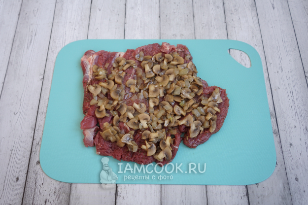 Возвращаемся к мясу. Оно уже хорошо промариновалось и готово к дальнейшему приготовлению. Раскладываем тонкий пласт бедра индейки и сверху выкладываем начинку.