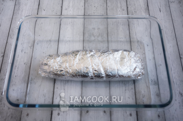Заворачиваем наш рулет в фольгу и плотно перевязываем нитками. Отправляем в жаропрочную форму и в заранее прогретую до 180 градусов духовку примерно на 20 минут.