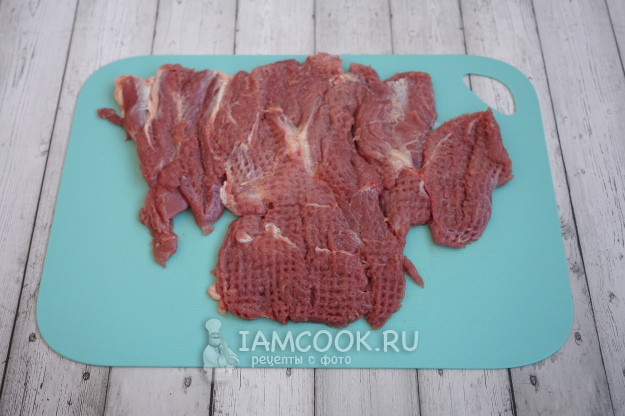 Теперь необходимо взять пищевую пленку, накрыть наше мяско и отбить молотком. Пленка в этом случае поможет не испачкать все вокруг.