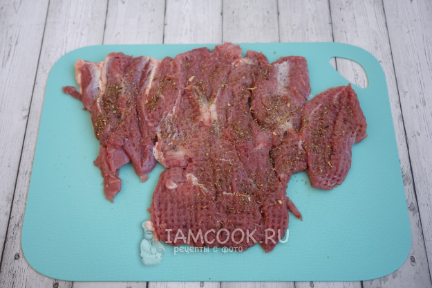 Далее солим, приправляем специями мясо с двух сторон и оставляем в покое минут на 10. За это время оно пропитается ароматами специй, а мы успеем сделать начинку.