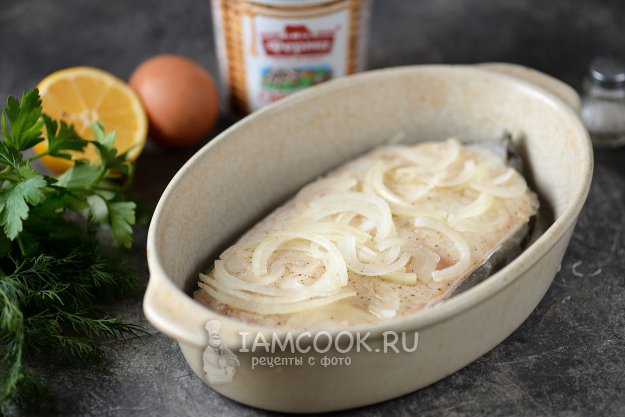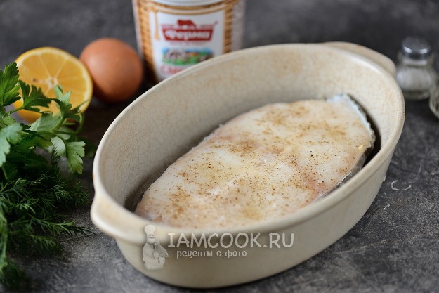 Тщательно промокните стейк зубатки бумажными полотенцами, переложите его в форму для запекания, полейте лимонным соком, посолите и поперчите по вкусу, отставьте в сторону мариноваться минут на 15. Форму, кстати, можно слегка смазать растительным маслом, совсем чуть-чуть.