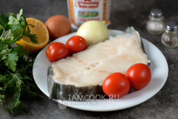 Возьмите все продукты для приготовления стейка зубатки в духовке в сметане с овощами. Лук почистите, помойте вместе с зеленью и помидорами. Настоятельно советую размораживать зубатку с вечера, из нее обычно выходит такое количество воды, что вы удивитесь, сливайте эту жидкость постоянно.