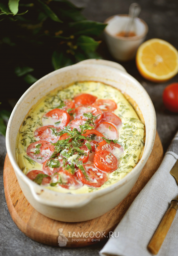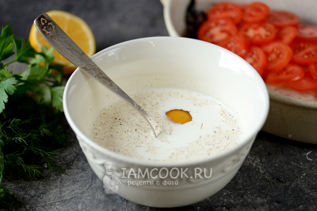 Нарежьте тонкими кружочками помидоры, выложите сверху на лук. Взбейте в глубокой миске сметану с яйцом, добавьте нарубленную зелень, немного соли и перца.