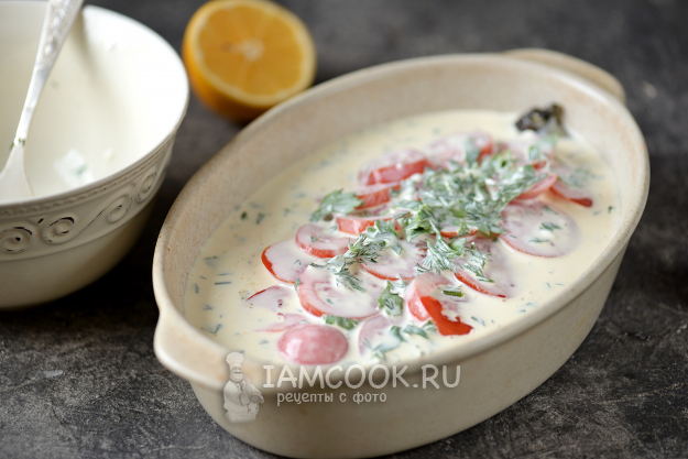 Вылейте сметанную заливку в форму, отправьте стейки зубатки со сметаной в духовку, предварительно разогретую до 190 градусов, на 40-50 минут в режиме верхнего и нижнего нагрева.
