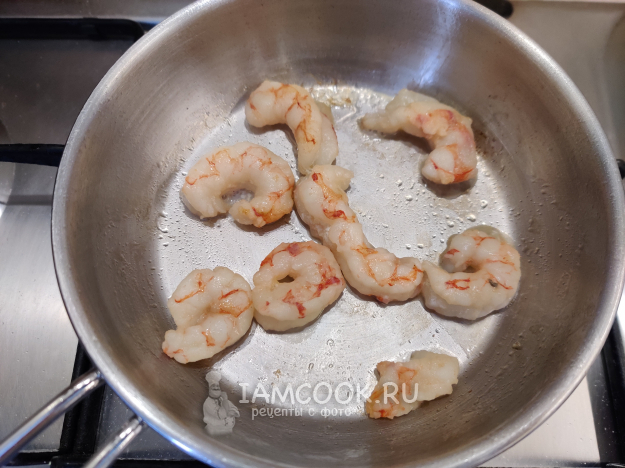 Креветок очистите и обжарьте на сливочном масле в течение 1 минуты, периодически помешивая. Сырых креветок не забудьте очистить от полой вены по всей спинке. Сырые креветки в готовом виде должны поменять свой цвет. Переложите креветок на бумажные полотенца, чтобы впиталось лишнее масло.