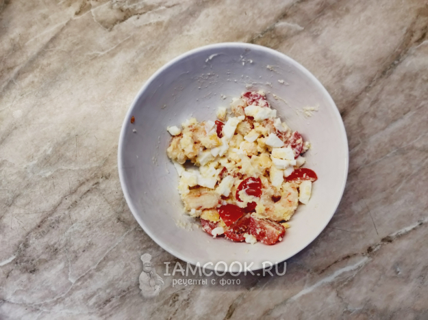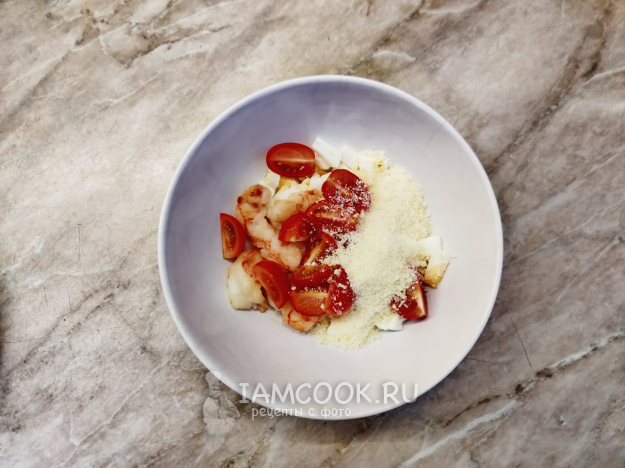 Помидоры вымойте и разрежьте каждый на 4 части. Оставьте несколько долек для украшения. Добавьте большую часть крошки пармезана. Небольшое её количество также оставим для украшения.