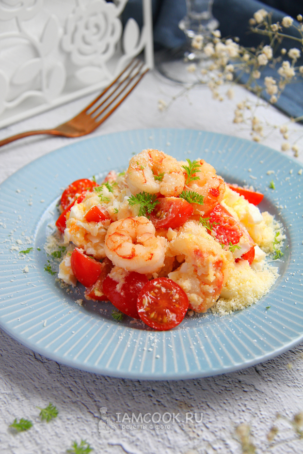 Готовый салат с креветками, помидорами и пармезаном украсьте помидорами черри и посыпьте сыром. По желанию можно добавить свежую зелень. Приятного аппетита!