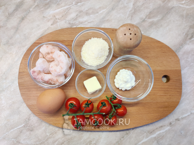 Подготовьте все необходимые ингредиенты для салата с креветками, помидорами и пармезаном. Замороженных креветок стоит заранее разморозить в холодильнике. Пармезан можно самостоятельно натереть на мелкой тёрке. Я же купила уже готовую крошку. Майонез можно заменить натуральным йогуртом без добавок.