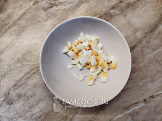 Параллельно отварите вкрутую яйцо, очистите и мелко нарежьте.
