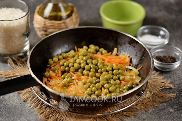 Добавьте зеленый горошек (консервированный или замороженный), пропущенный через пресс чеснок, перемешайте, подержите минуту-другую, снимите сковороду с плиты.
