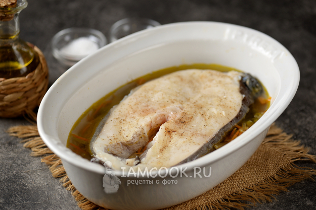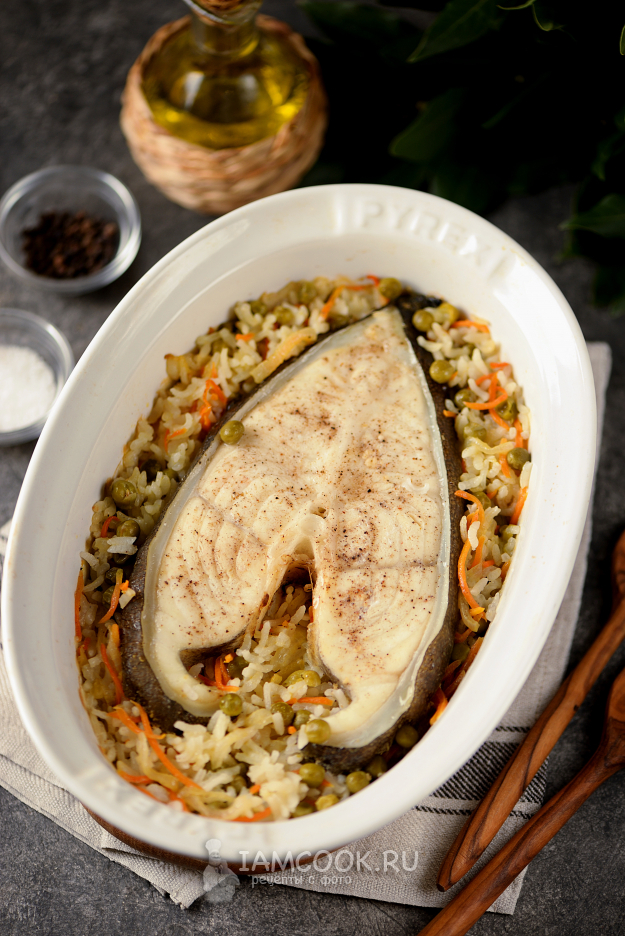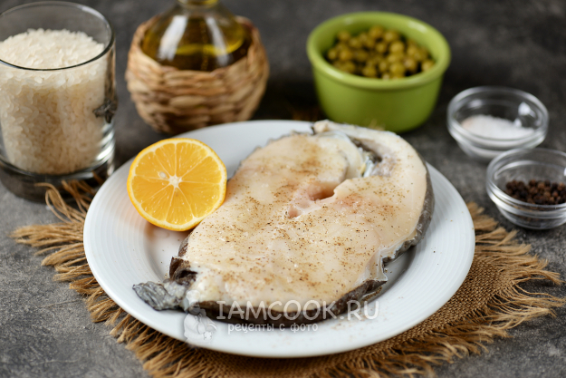 Выложите сверху стейк зубатки, влейте стакан воды из чайника, она должна покрывать не только рис, но и рыбу почти полностью.