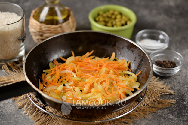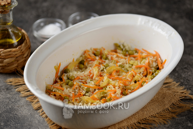 Переложите в удобный противень тщательно промытый рис, переложите к нему обжаренные овощи, посолите и поперчите по вкусу, перемешайте.