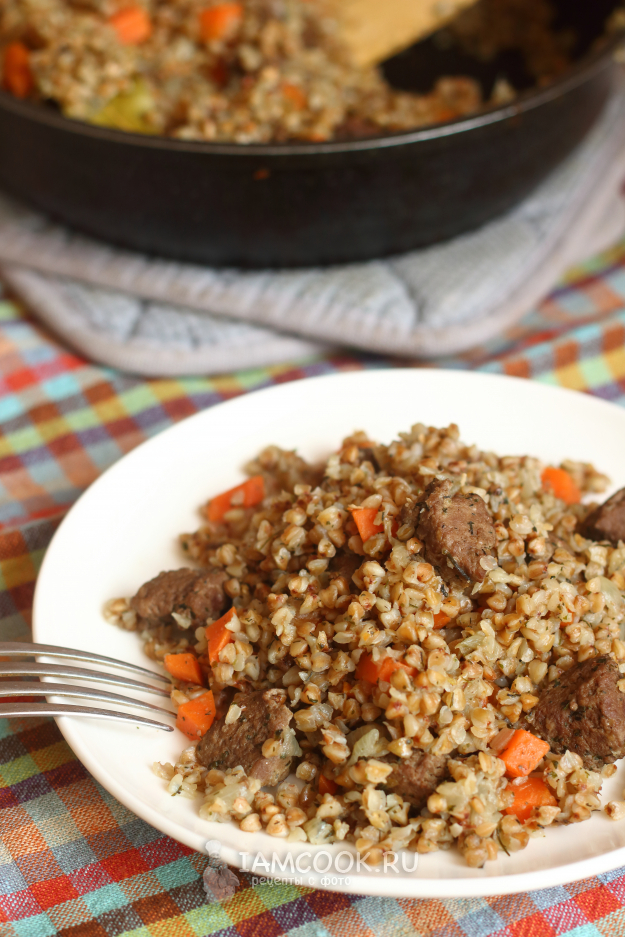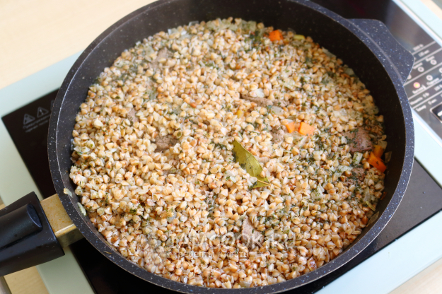 Прикройте крышкой и готовьте гречку с говяжьей печенью на сковороде на маленьком огне до полного впитывания жидкости (примерно 15 минут).